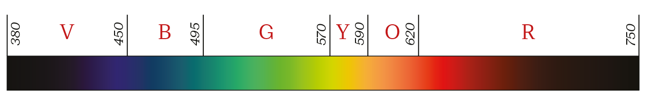 Second, in a rainbow, there are different widths for each “pure” color. This means that we cannot use the rainbow as an evenly dispersed gradient for a range of values because it is inherently uneven. Consider the rainbow spectrum shown below: