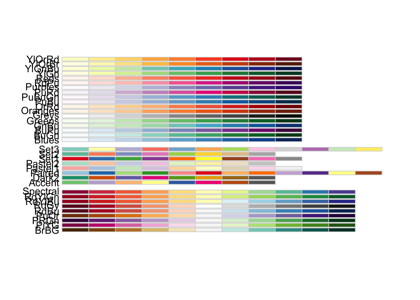 Qualitative Distinct colors to accommodate categorical data Figure fig-colorBrewer, middle