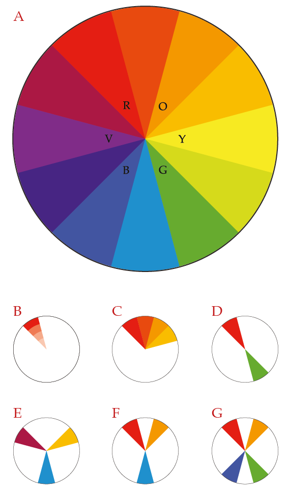 When manually choosing colors, begin with a color wheel divided into discrete colors Figure fig-Color-wheel-1 a. The primary colors, Red, Yellow and Blue are arranged in an equilateral triangle. The secondary colors, Orange, Green and Violet are positioned in an inverted equilateral triangle interspersing the primary colors. Tertiary colors fill in the remaining gaps. Consider the following conventions when choosing a color scheme based on this color wheel.