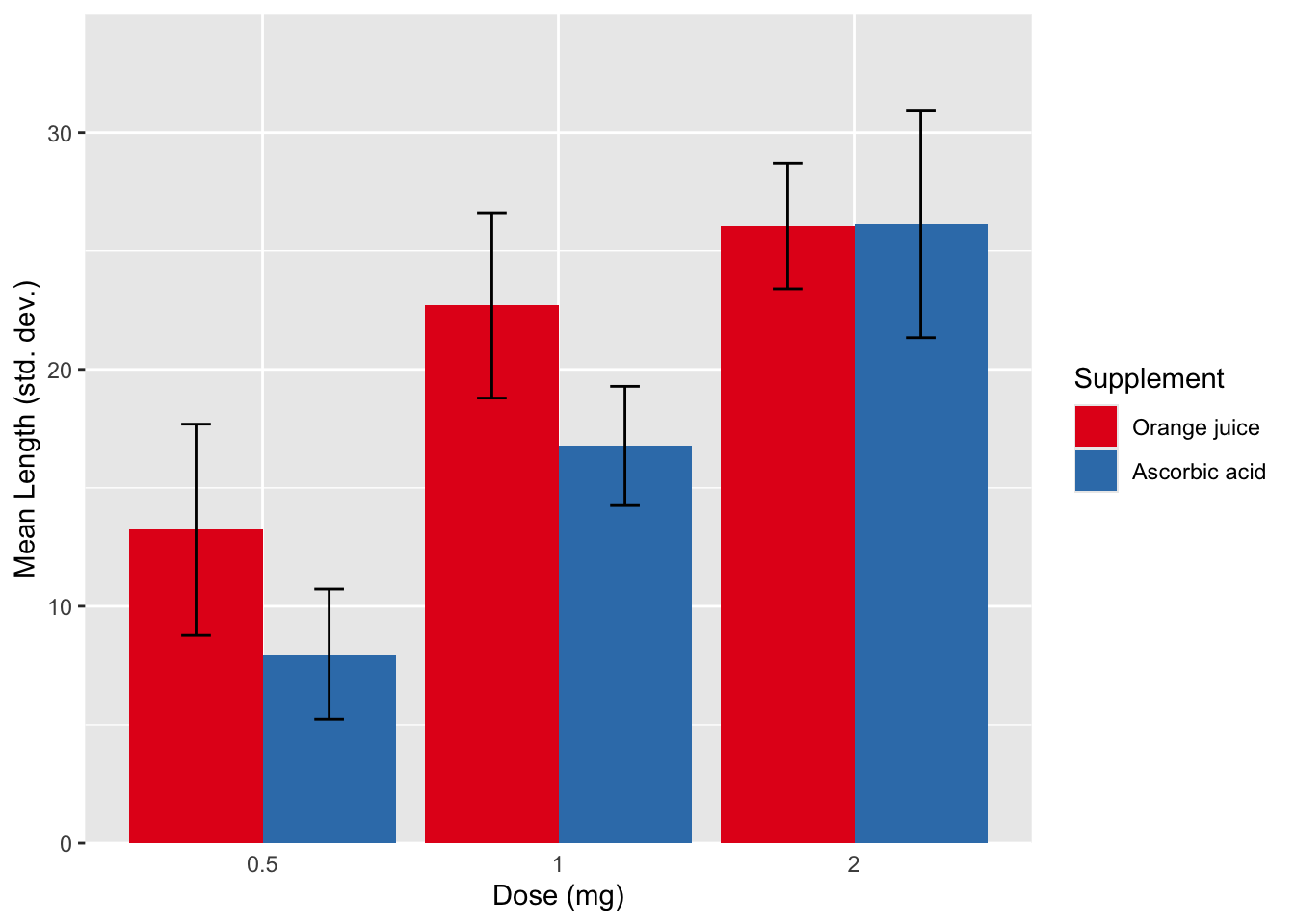 Exactly what the variables are requires further input, but we already know the experimental design without any introduction. This plot depicts the mean length of odontoblasts (the cells responsible for tooth growth) from 60 guinea pigs is described by two variables. Dose levels of vitamin C (3: 0.5, 1, and 2 mg/day) and delivery method (2: orange juice or ascorbic acid, a form of vitamin C).
