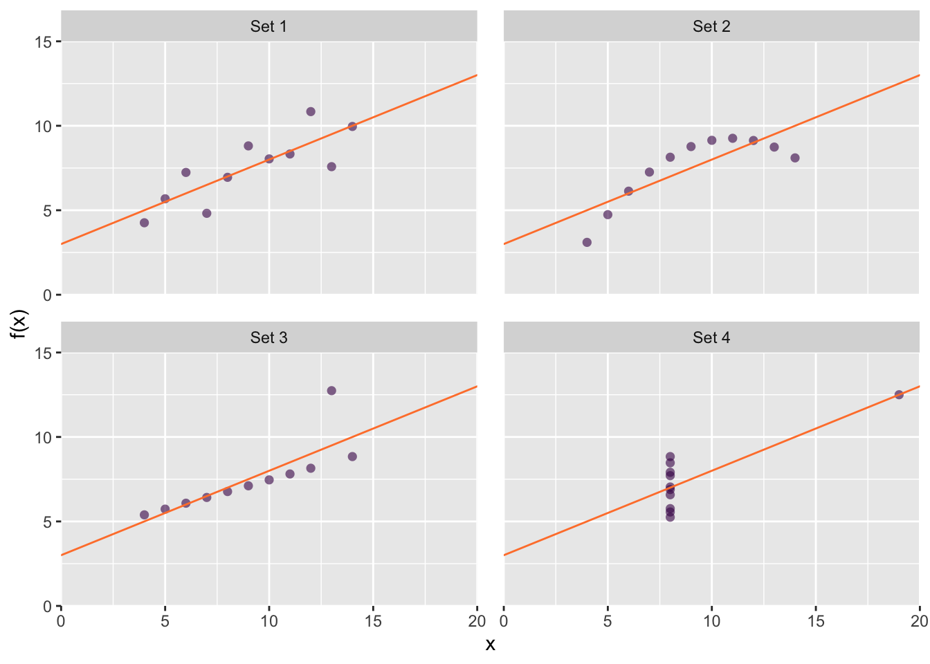 Figure 67.1: Anscombe’s plots. Although their distributions are distinct, each data set is described by the same linear model and correlation coefficient. Relying on numerical analysis alone does not tell the complete story.
