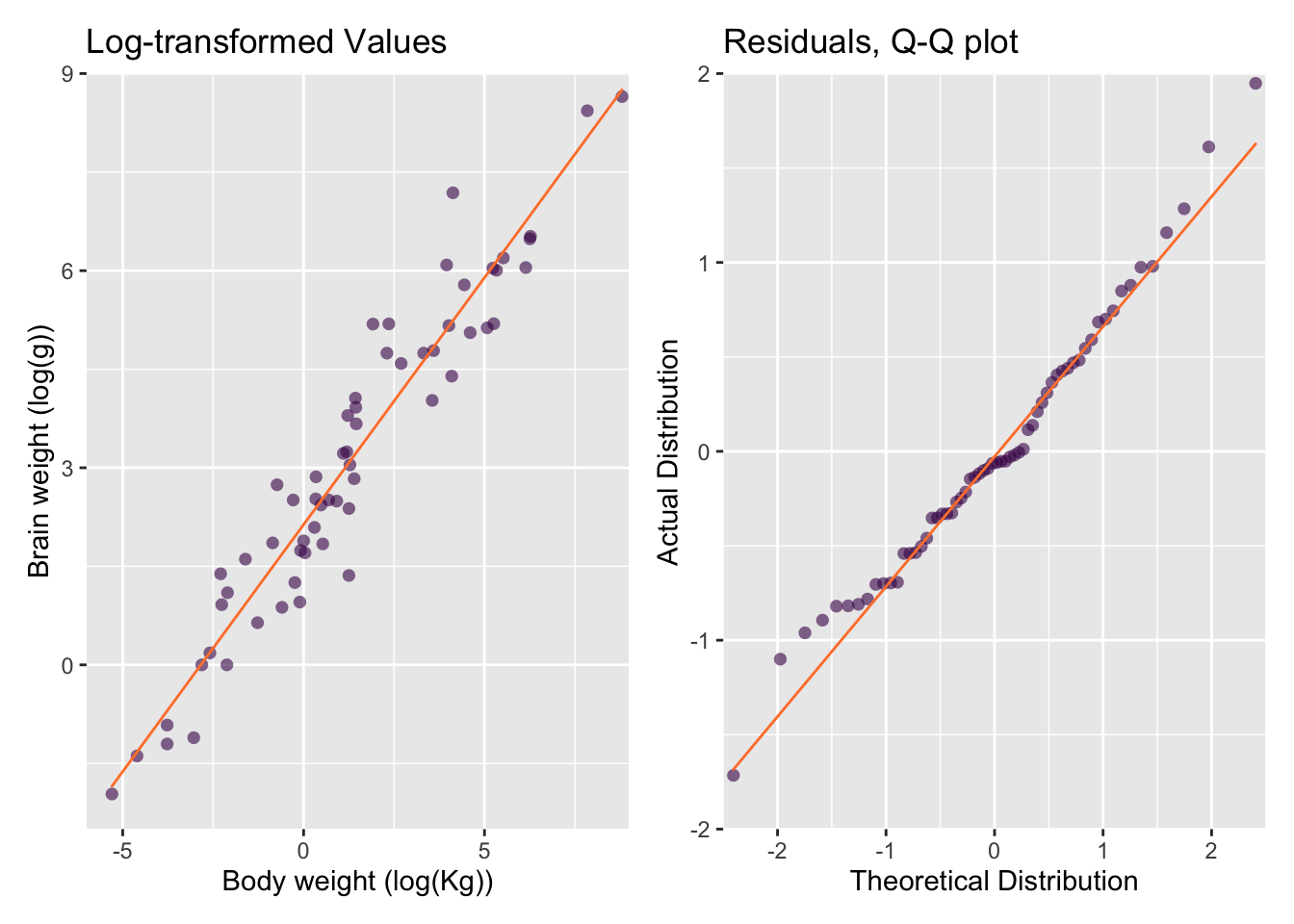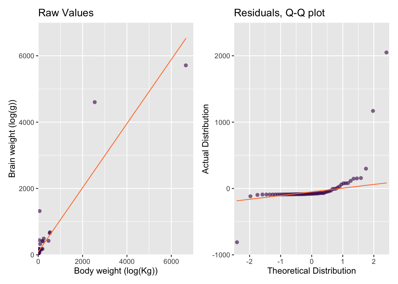 In a well-fit model, the distribution of the residuals — the distance between each observed and predicted \(y\) value, \(y_i - \hat{y}\), should be Normal. In our case that means that the differences between the observed and predicted brain weights should be Normally distributed. A typical and useful diagnostic plot for for assessing distributions is a Quartile-Quartile (Q-Q) plot. For now, all we need to know is that the more closely our residuals (the dots) fall onto the Q-Q line (Figure 67.2, bottom), the farther they are from a normal distribution. This confirms our suspicions that our model is not really the best choice.