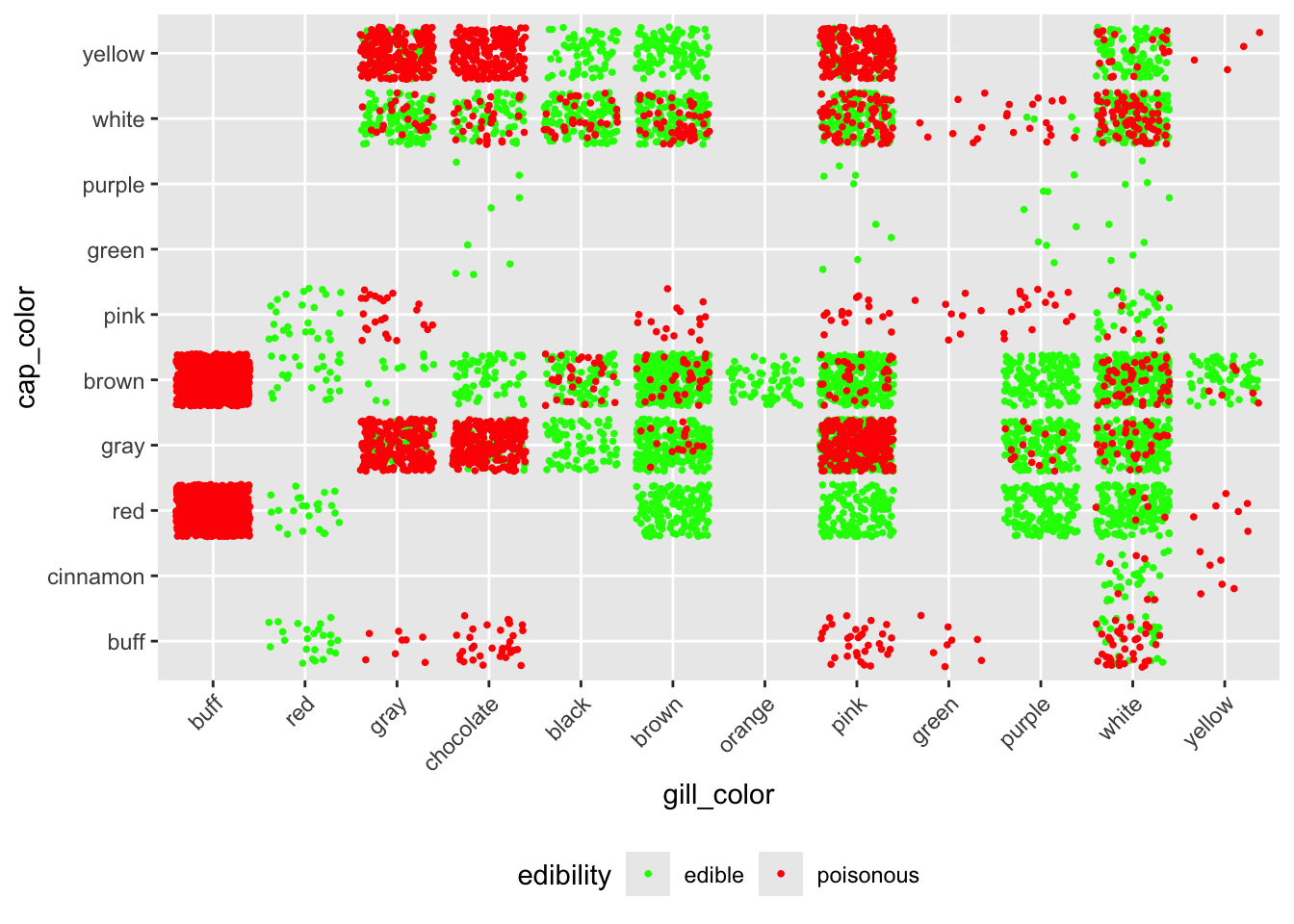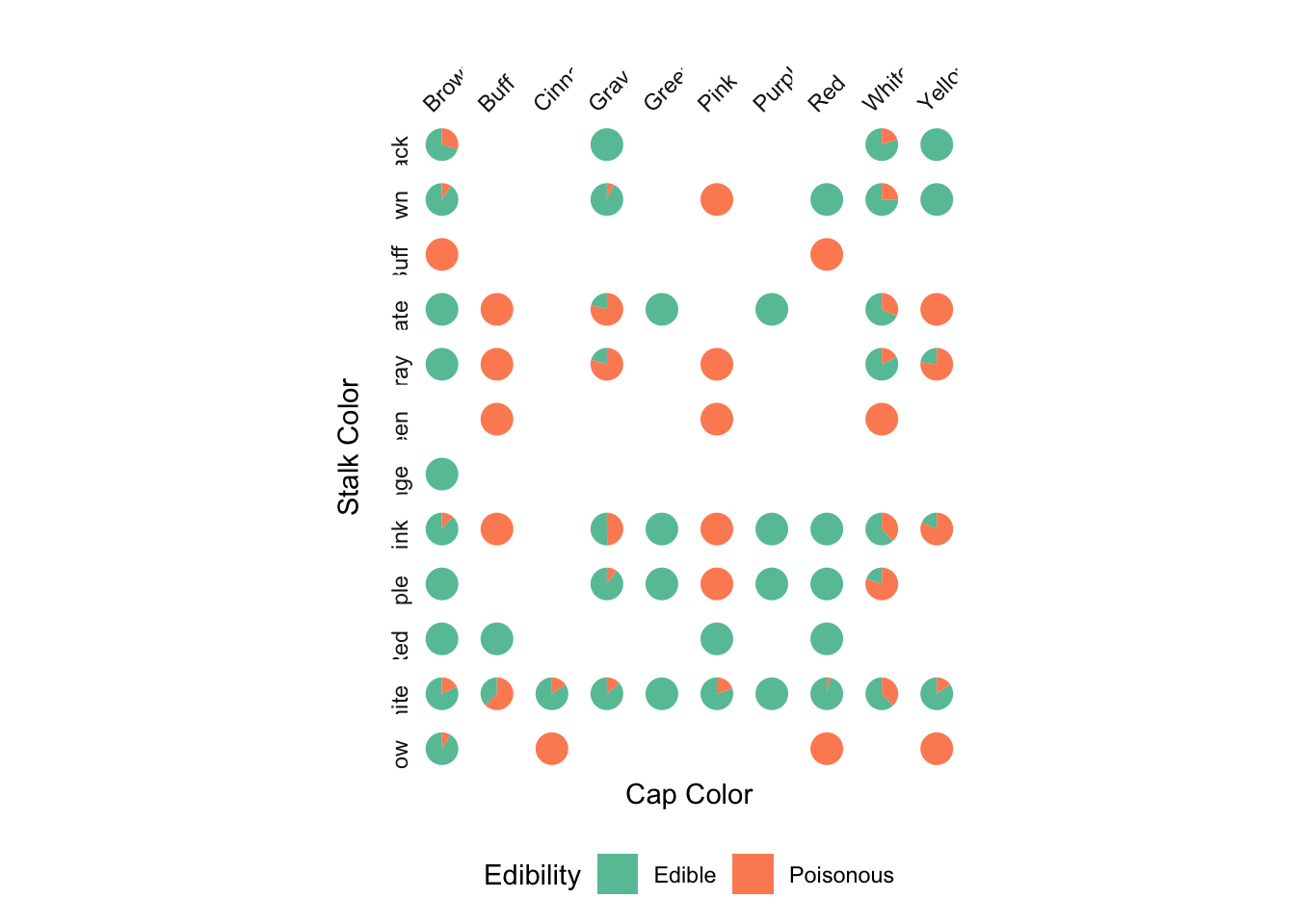 Here, I’ll use the mushroom data set, which is popular in machine learning exercises. The underlying research question is, given many input variables, can we predict if a mushroom is going to be poisnous or not? Figure 86.1 is a very rough exploratory plot of two variables that influence edibility: the cap color and the stalk color.