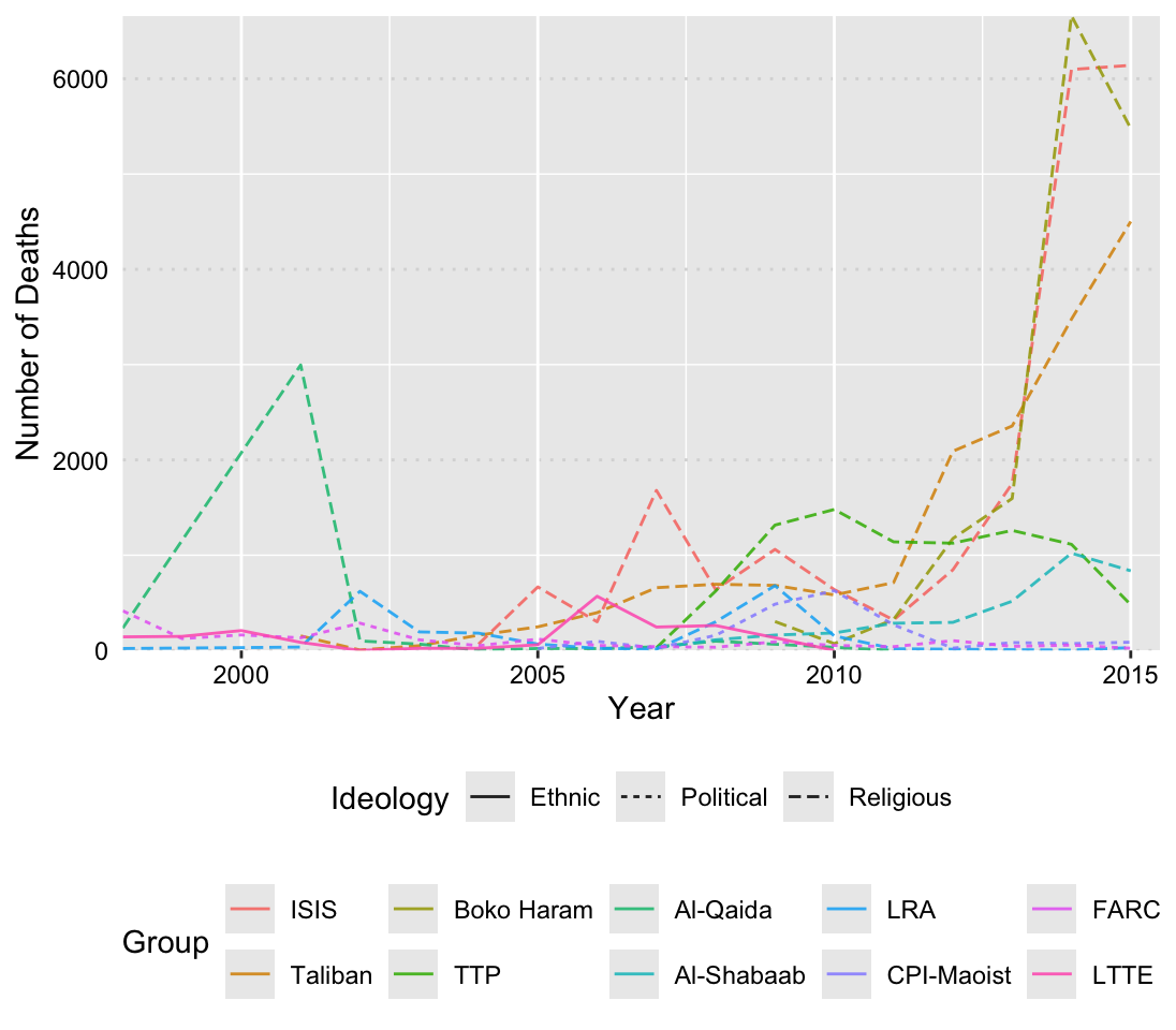 Since this plot has a time component, we would also be interested to see how terrorist attacks have changed over time, i.e. map time onto the x axis. Plotting an individual line for each group is inefficient, since there would be many colors. Plus, I want to know the group’s ideology, which means I have to do more work.