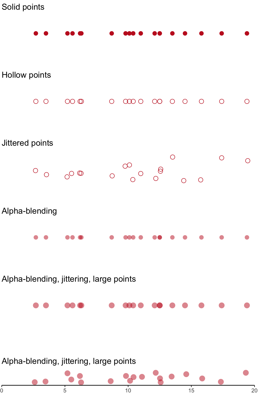 Strip plots are one of the easiest and simplest ways to visualise a distribution. Here, we encounter the frequently observed problem of over-plotting - multiple data points obscure each other and the distribution is falsely represented. To overcome this, we can use four methods: