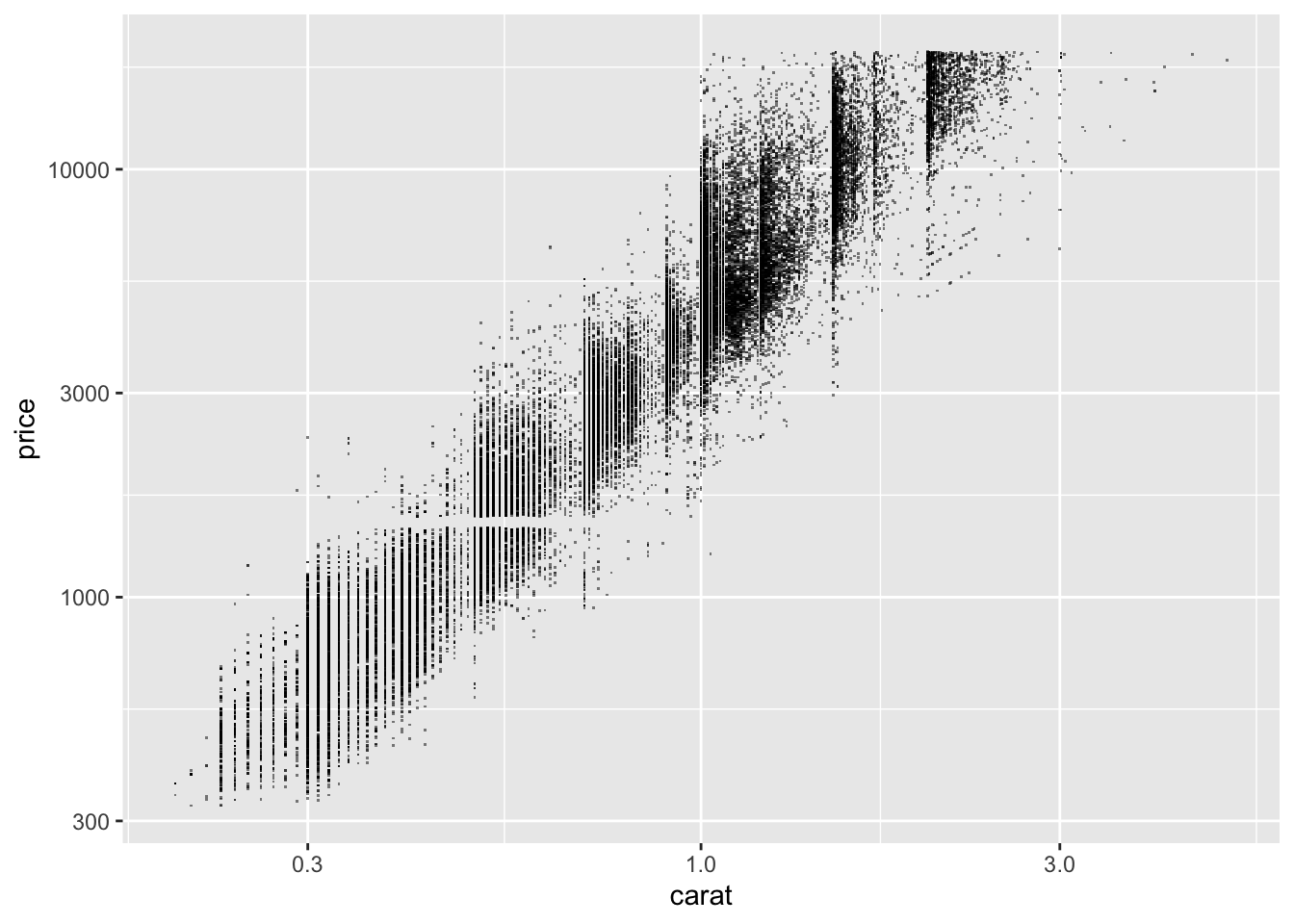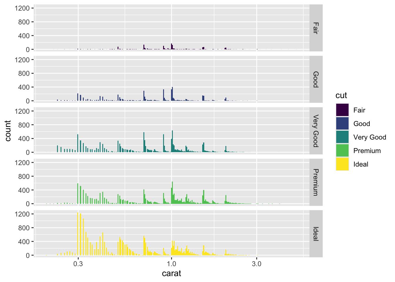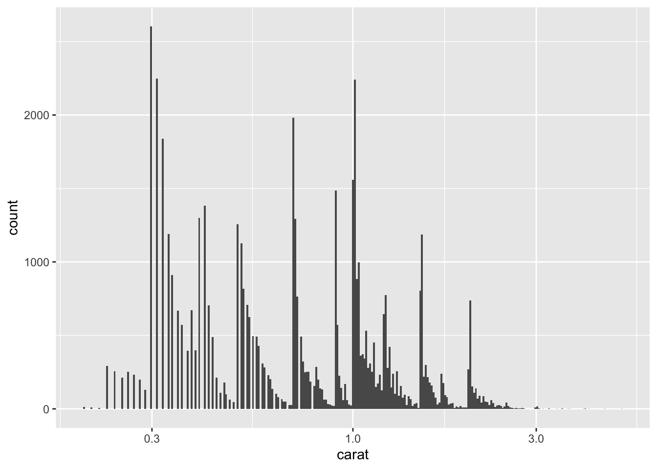 At this point it seems appropriate to return to a univariate distribution to explore this trend more closely. In the figure below we can see the spikes in count at specific carat values but also the sparseness in values at the low end. That is , the negative space in out plot also contains information and we only see that when the bin width is small enough.