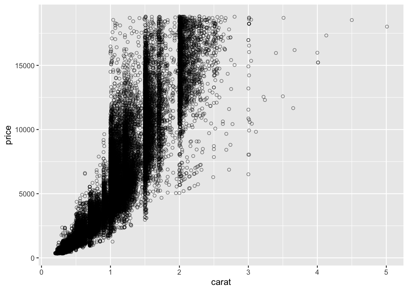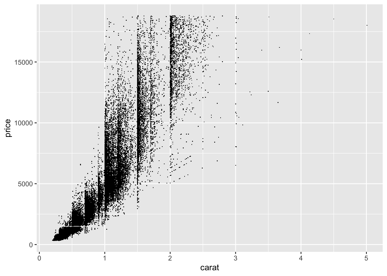 In this section I’ll explore combinations of attributes for dealign with overplotting that occurs with a large dataset, or in particular, when regions of high-density