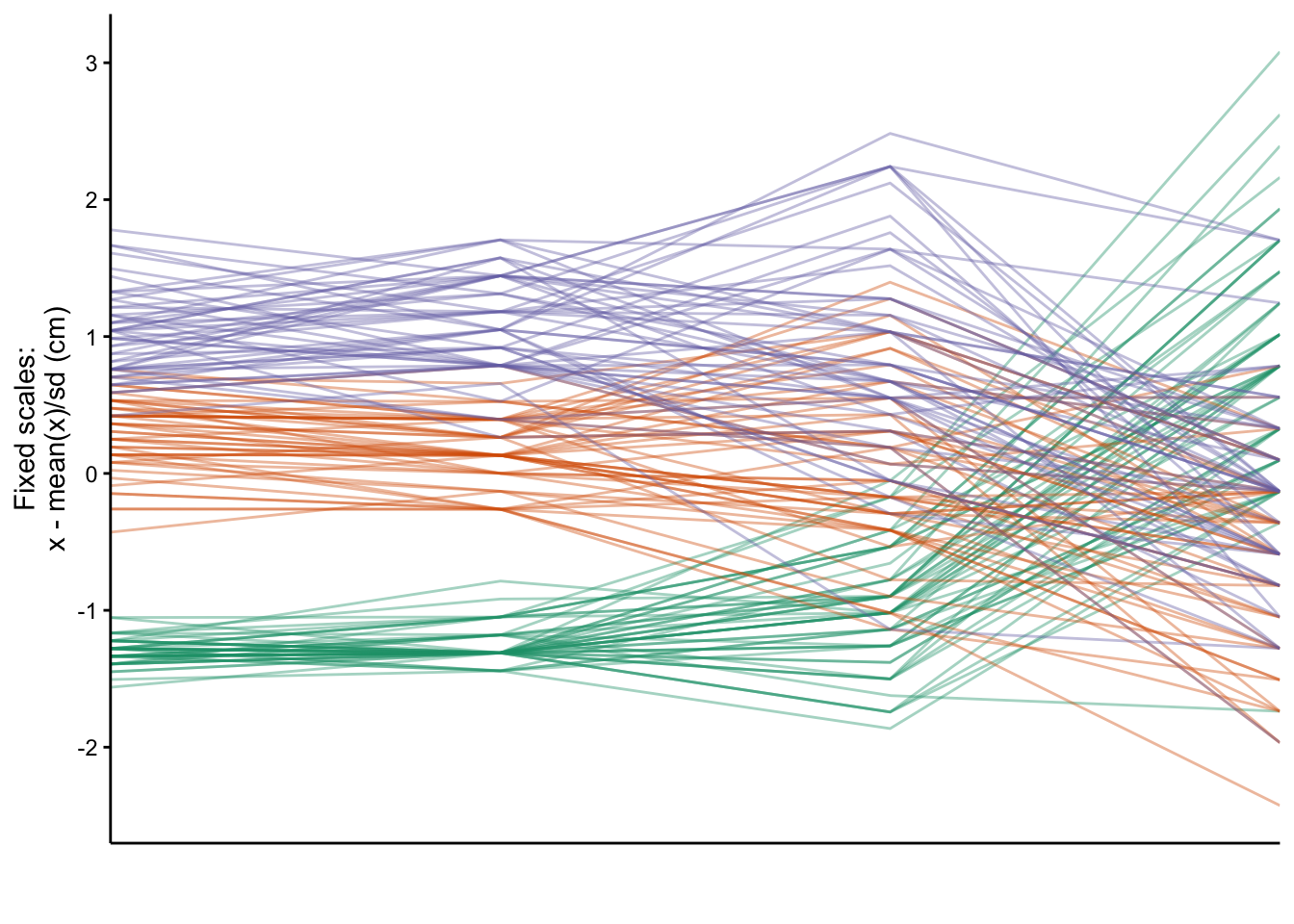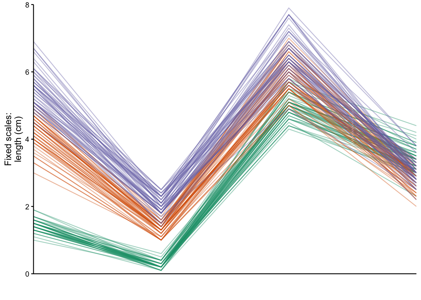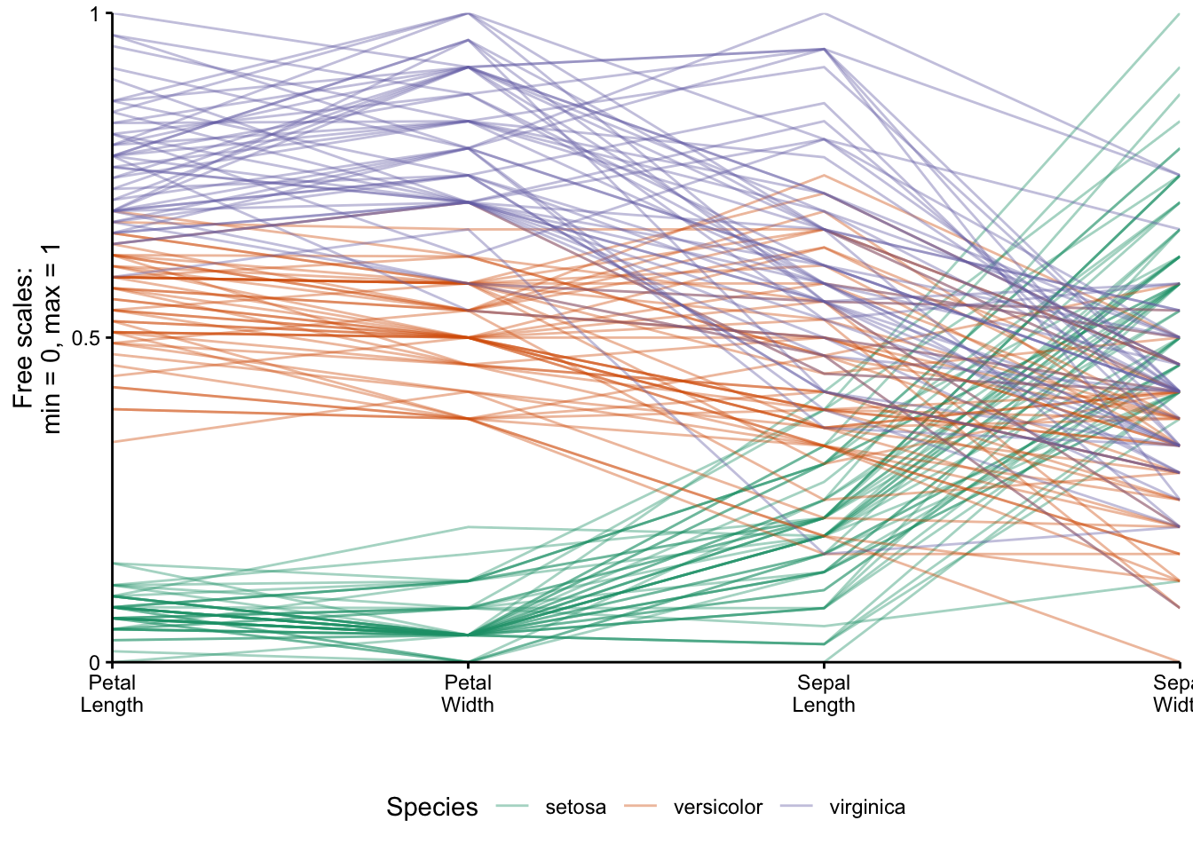 There are a number of y-axis transformations that can be applied to the parallel plots. An example of a fixed scale transformation is plotted for the original values, minus the mean/sd (fig. @ref(fig:Iris-parallel-plots), middle). This transformation makes the Sepal Length and Sepal Width relationship more obvious. A free scale allows each variable to be plotted on its own scale, where the minimum is given 0 and the maximum 1 (fig. @ref(fig:Iris-parallel-plots), bottom). By placing each sub-group on a different scale, we can get an impression of the relative distribution of each group.