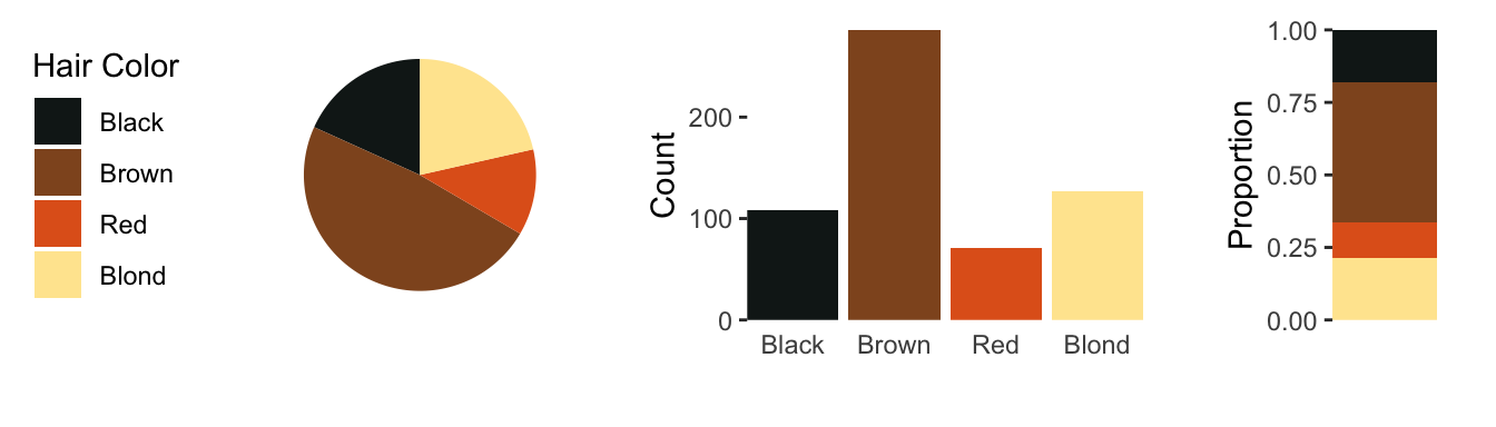 We are often interested in understanding parts-of-a-whole, that is, the proportions of each group in a categorical variable. Molecular biologists will be familiar with a common part-of-a-whole question concerning gene classifications. In a list of significantly over-expressed genes identified by a large screen, like a microarray or a mass spectrometry, we can ask the question which gene families are more abundant than expected? which are less abundant? Consider the single variable, hair color in \(n = 592\) individuals.