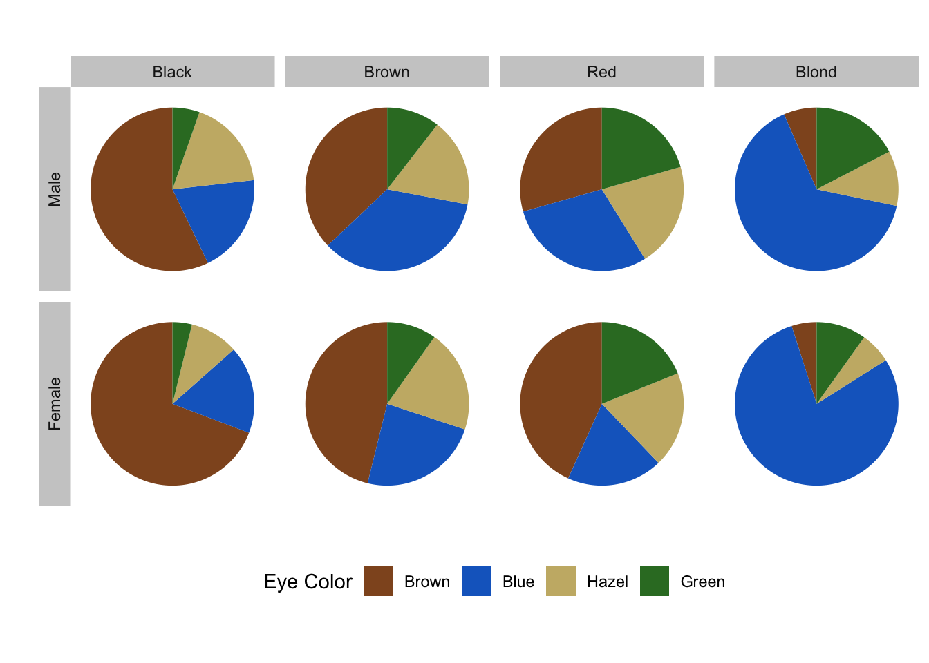 In this case a stacked bar chart, although easier to read, it not that much more informative than the pie chart. This changes quickly once we start adding variables, like eye color and sex. If we continue along these lines we’ll end up with a collection of pie charts and bar charts which fail to serve the purpose of