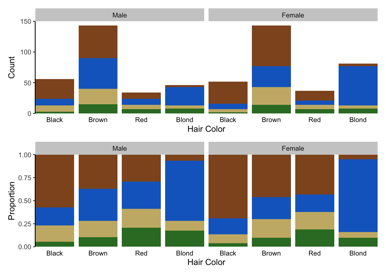 Stacked bar charts are an improvement over the pie charts since at least some of the sub-groups are plotted on a common scale. However, since we have four categories, only the two at the bottom and top of the bar chart benefit from this feature. In Figure fig-stacked-bar-plots we have plotted the three variables as three pair-wise plots. Although all our data is visualized, these plots fail to really tell a story, we still don’t know which sub-groups are over- or under-represented and the relationship between hair and eye color is not displayed, a third plot would be required for that.