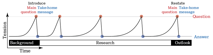 As the engine of your presentation tension is built up and then released several times throughout the talk, as depicted in figure ?fig-str. Notice that the key take-home message can (and should be) presented at the beginning of the talk.